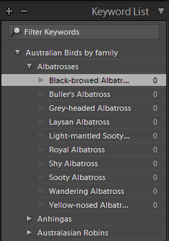 5. After the import has finished you will have a top-level keyword list (e.g. 'Australian Birds by family') - expand this to see all the species organised by family.